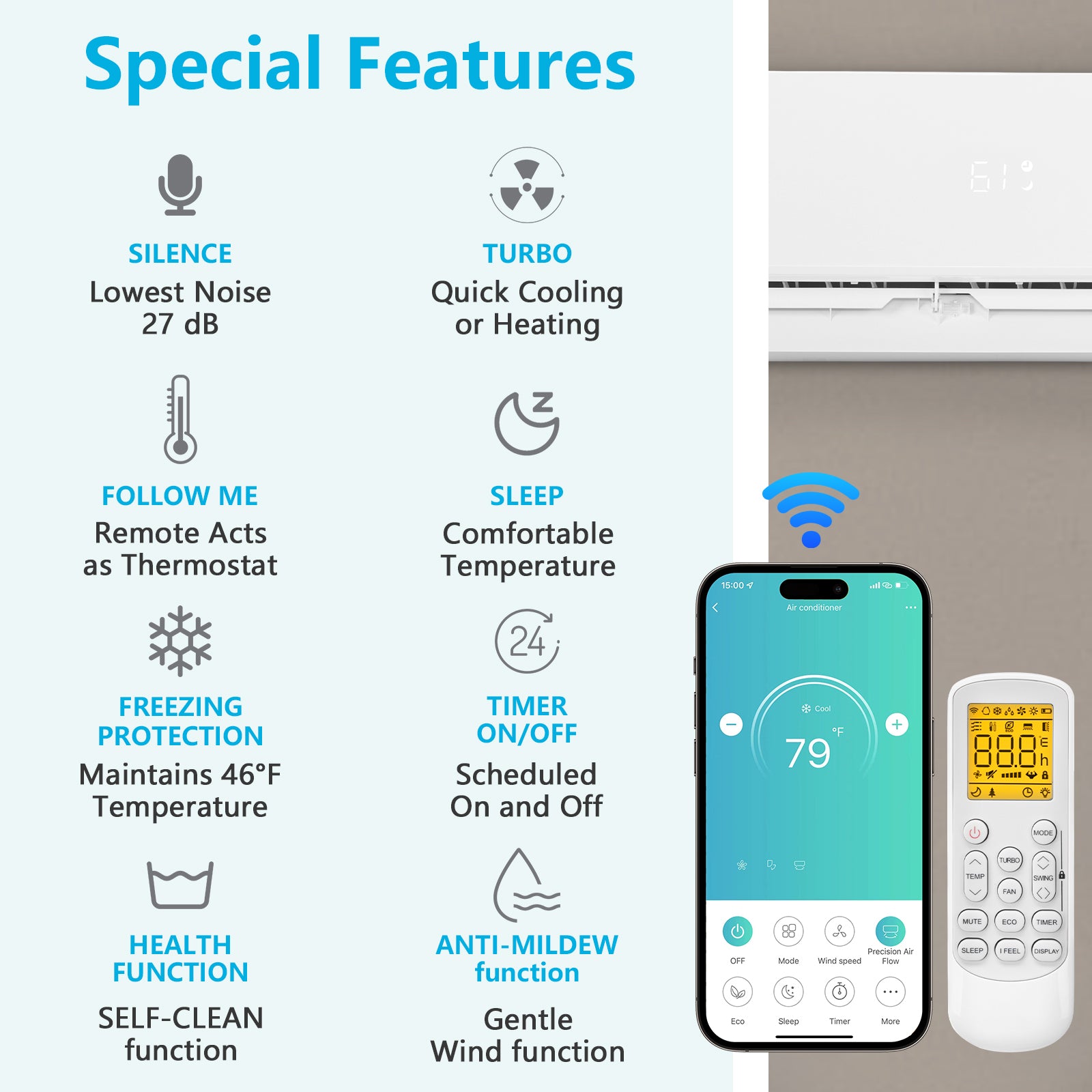 - [4-IN-1 Multi-Function]Featured with Cooling, Heating, Dehumidifying and Fan only modes in one compact unit. This mini split AC/heating system is multifunctional. It is ideal for using in home's bedroom, living room, kitchen, office, apartment, garage and so on.