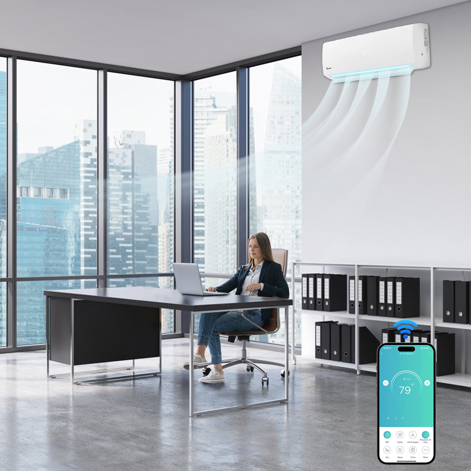 - [4-IN-1 Multi-Function]Featured with Cooling, Heating, Dehumidifying and Fan only modes in one compact unit. This mini split AC/heating system is multifunctional. It is ideal for using in home's bedroom, living room, kitchen, office, apartment, garage and so on.