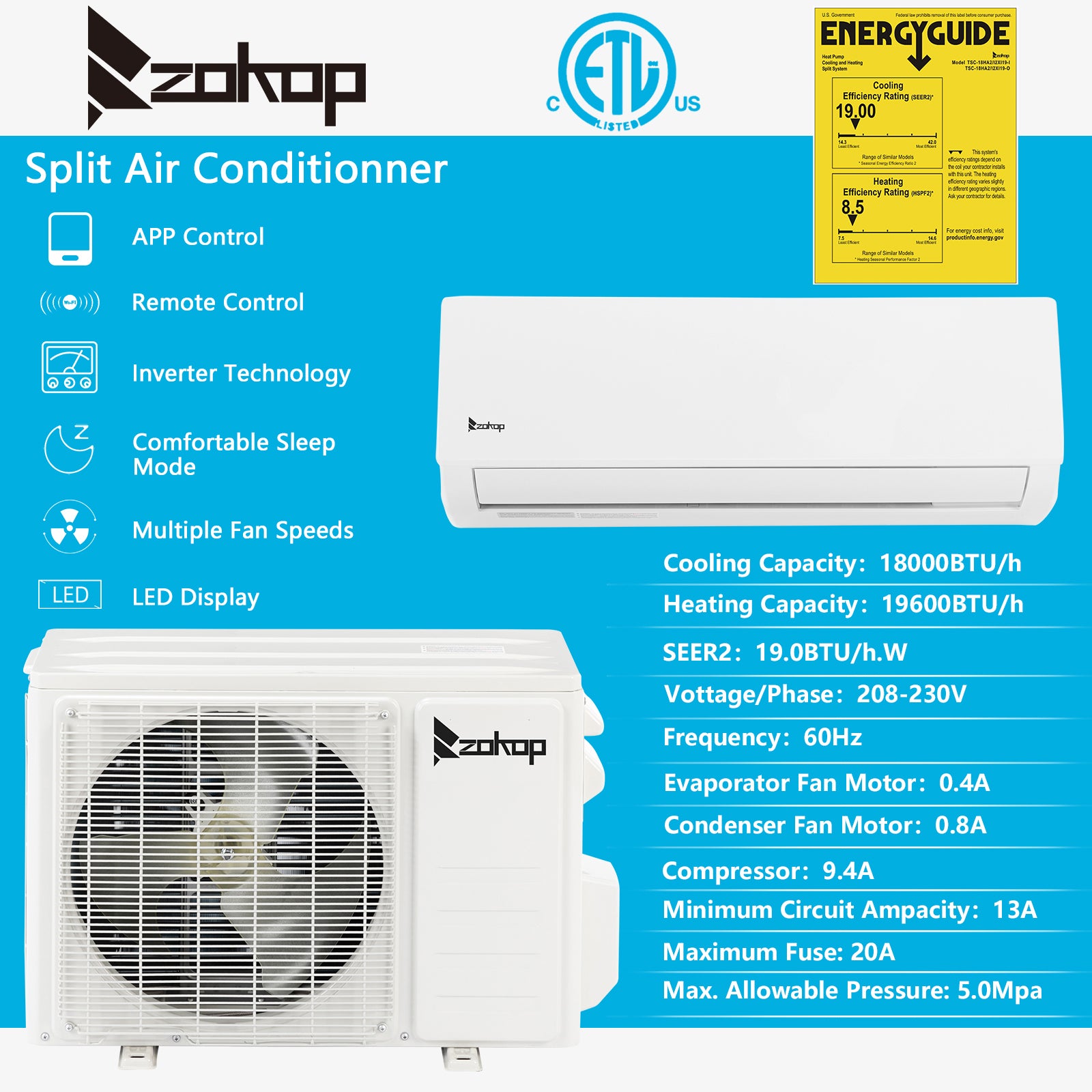 - [Energy Saving] ZOKOP the speed of the air conditioner equipped with frequency converter directly affects the service efficiency of the air conditioner. The frequency converter is a control system used to control & adjust the speed of the compressor to make it always in the best speed state, so as to improve the energy efficiency ratio (at least 30% more energy-saving than the conventional air conditioner). This 19 SEER2, 18000BTU, 208/230V, 60Hz, AHRI Certified AC unit with a heat pump is featured high quality compressor for more efficient cooling and longer working life; Higher SEER grade & Eco-friendly design which leads you for money saving (please confirm voltage before making purchase ).